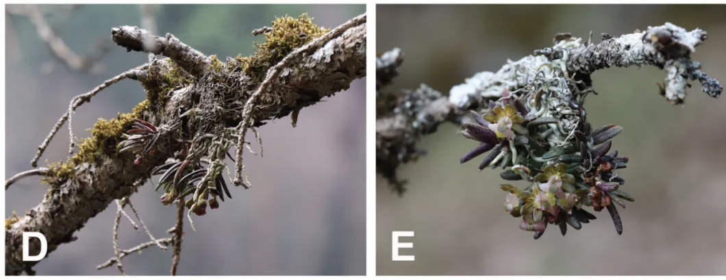 作为小型附生植物,九寨沟盆距兰常为悬垂状,高仅2-4厘米,叶片斜线状披针形,带紫红色斑点,花呈黄绿色,前唇表面光滑,肾形,紫红色,反卷,独特形态使其区别于同属其他物种。目前该物种仅见于海拔2400-2600米的亚高山针阔混交林交界处,且仅在五花海栈道边枯枝上发现少数个体。