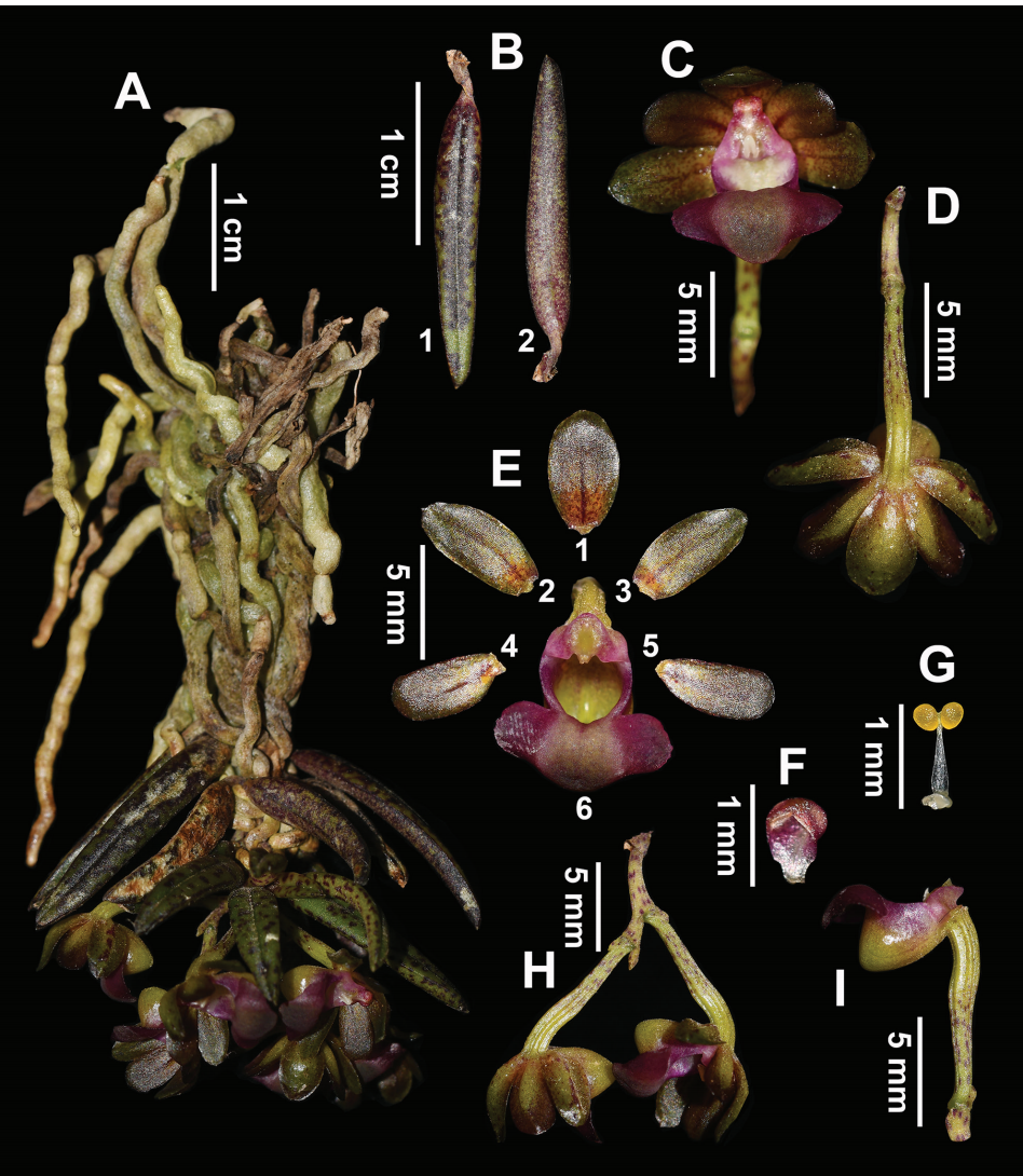 九寨沟盆距兰解剖图版A: 开花植株;B: 叶片;C: 花正面观;D: 花背面观;E: 花解剖图照(E1:中萼片,E2-3: 侧萼片E4-5 : 花瓣 E6 : 唇瓣);F: 药帽;G: 花粉团;H: 总状花序侧面观;I: 唇瓣侧面观