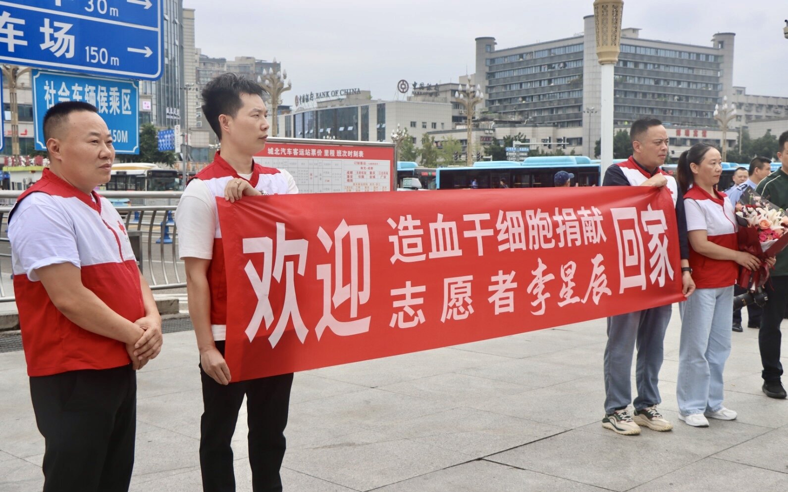 南充市、顺庆区红十字会的工作人员和同事们“欢迎造血干细胞捐献志愿者李星辰回家”。(拍摄:陈静)